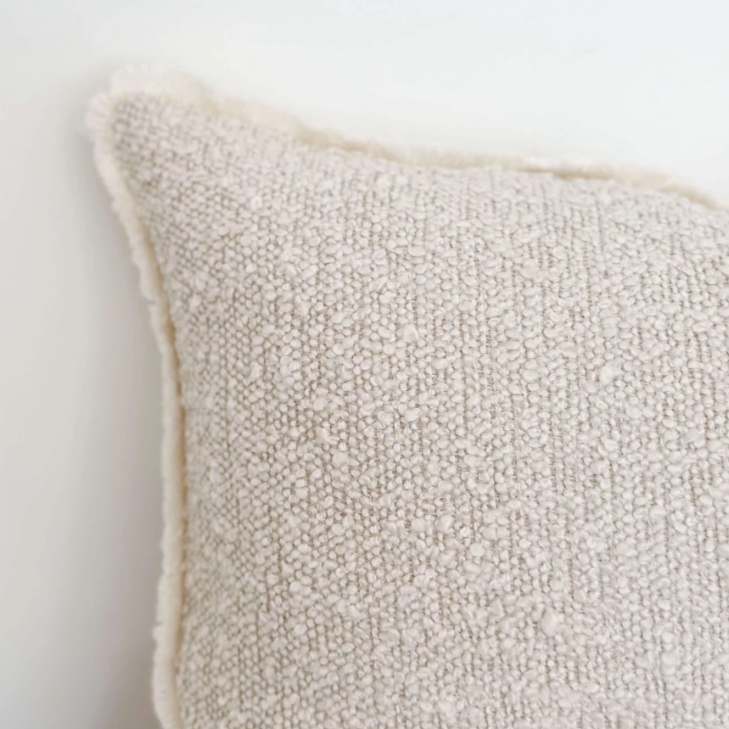 Introducing the Axel Cream Boucle Cushion. Our boucle cushion offers a fringed edge and a soft textured finish. This cream cushion is perfect for adding texture to your neutral decor. Includes luxurious feather cushion filler.