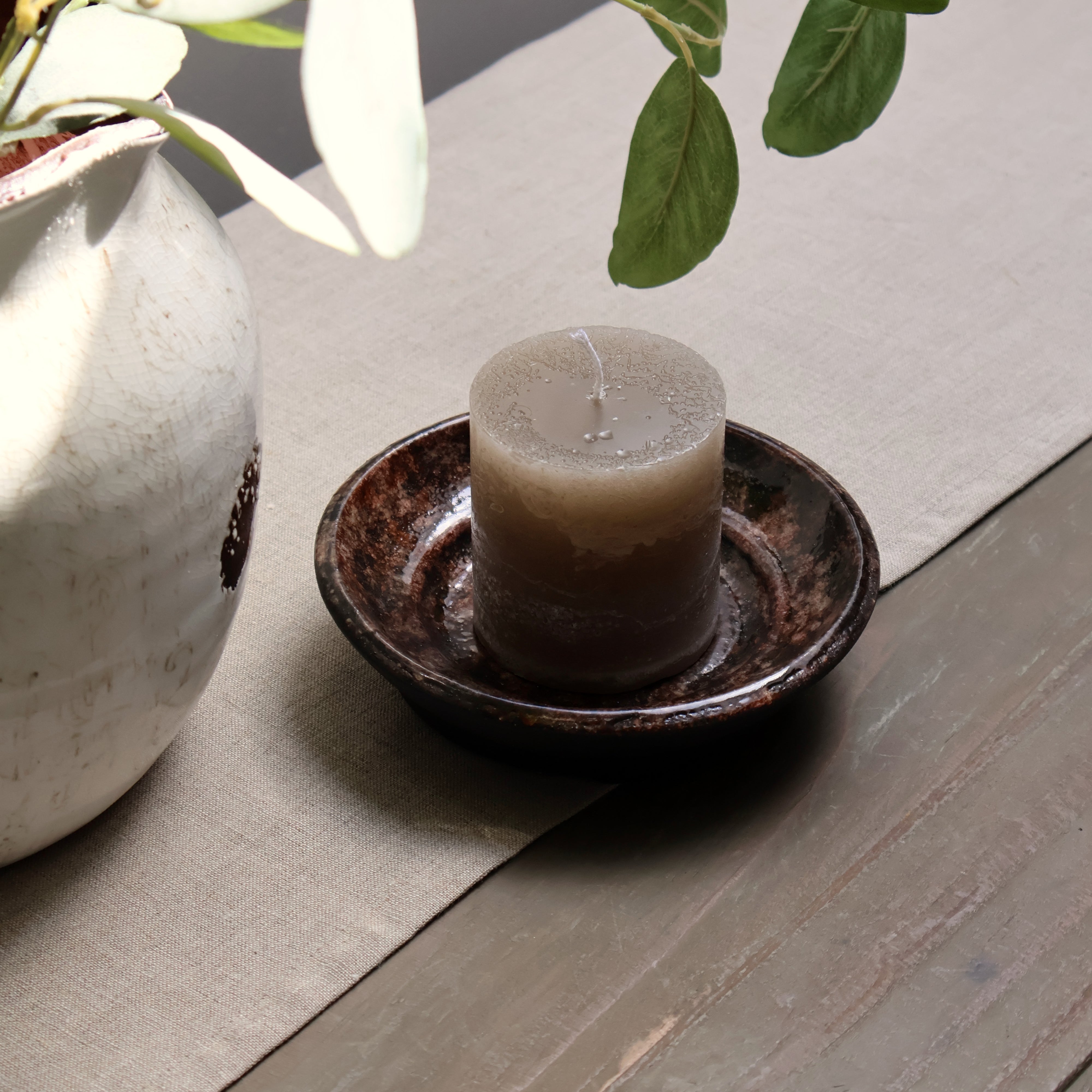 This candle plate is perfect for showcasing pillar candles, it can also be used as a styling piece on shelves/consoles or as a bowl to hold items such as keys or jewellery. It exudes craftsmanship and intense colours.