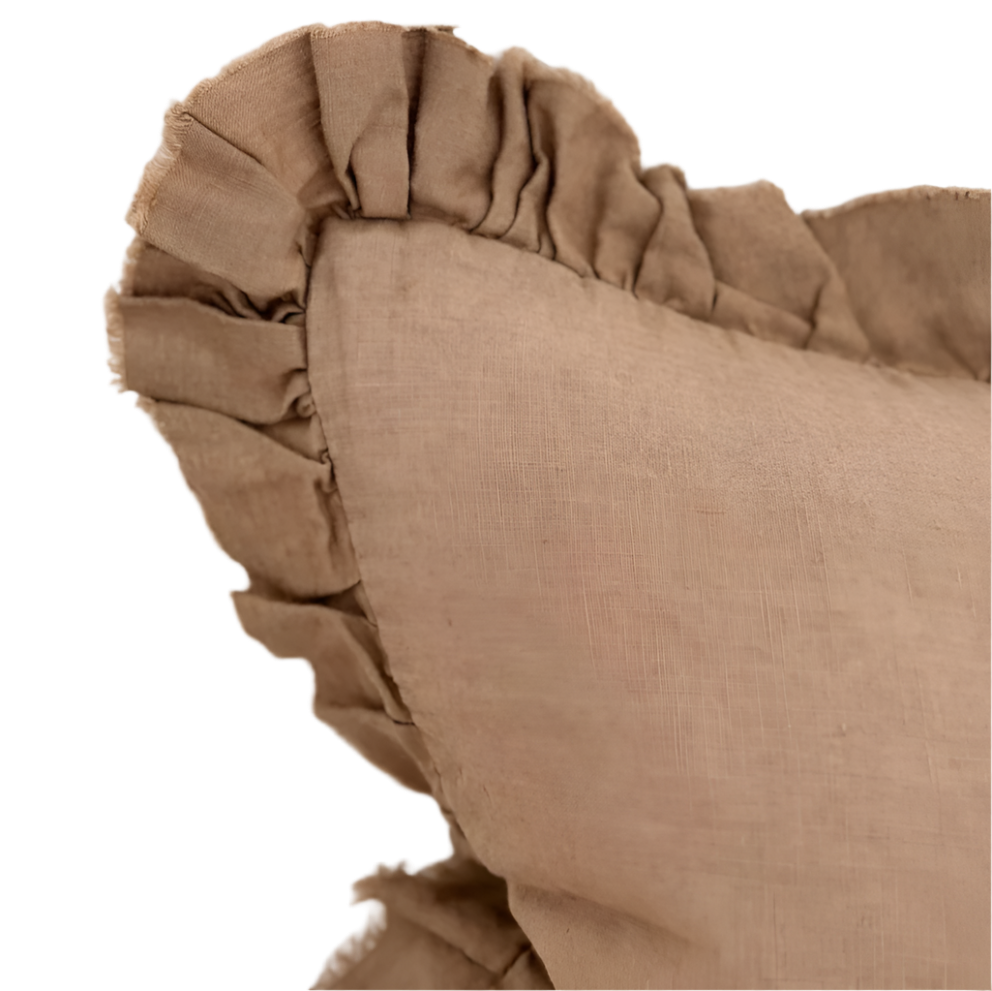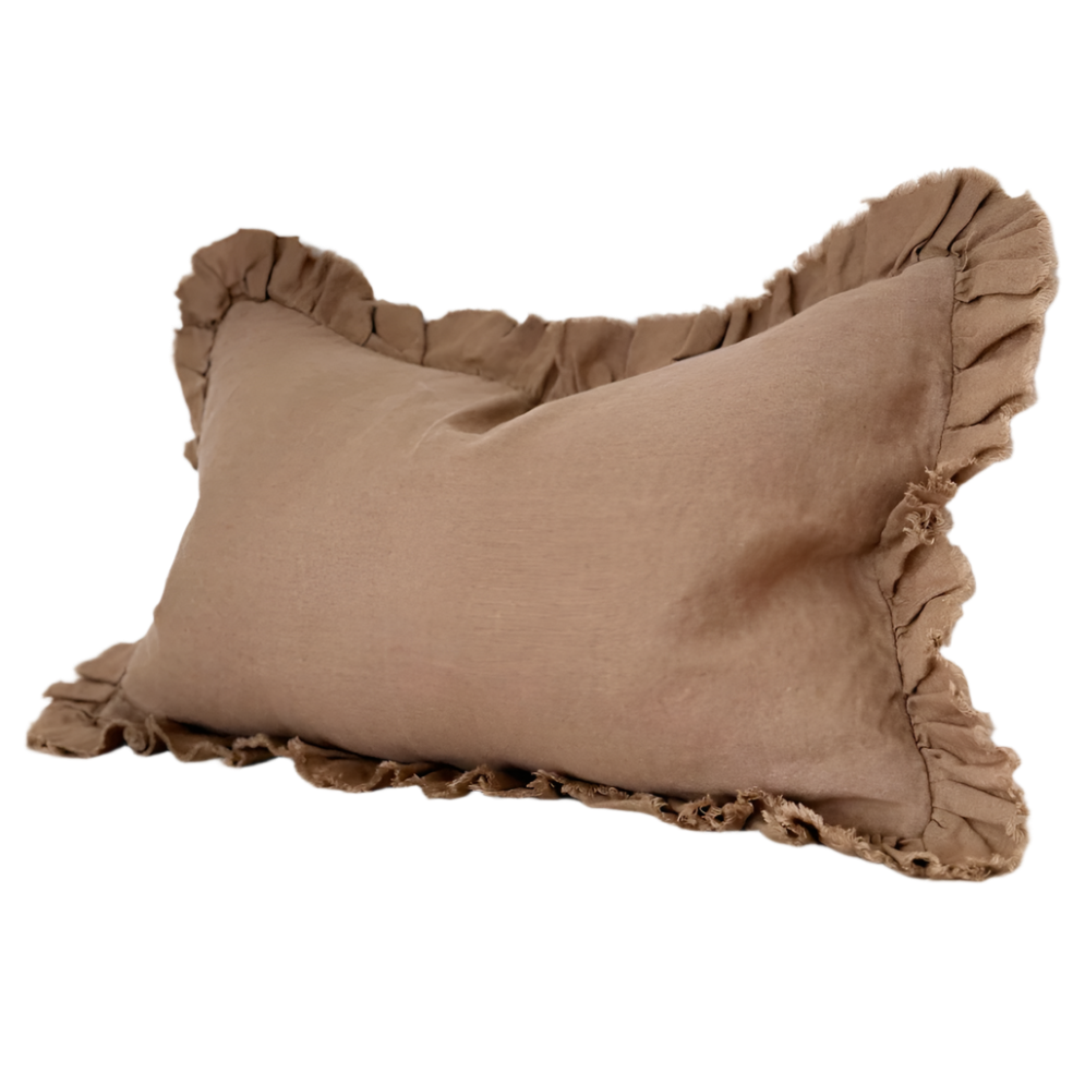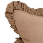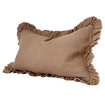 Introducing the Celia Brown Ruffle Cushion. This rectangle cushion boasts a lush coffee brown hue, evoking a sense of tranquillity and timeless elegance. Includes luxurious feather cushion filler.
