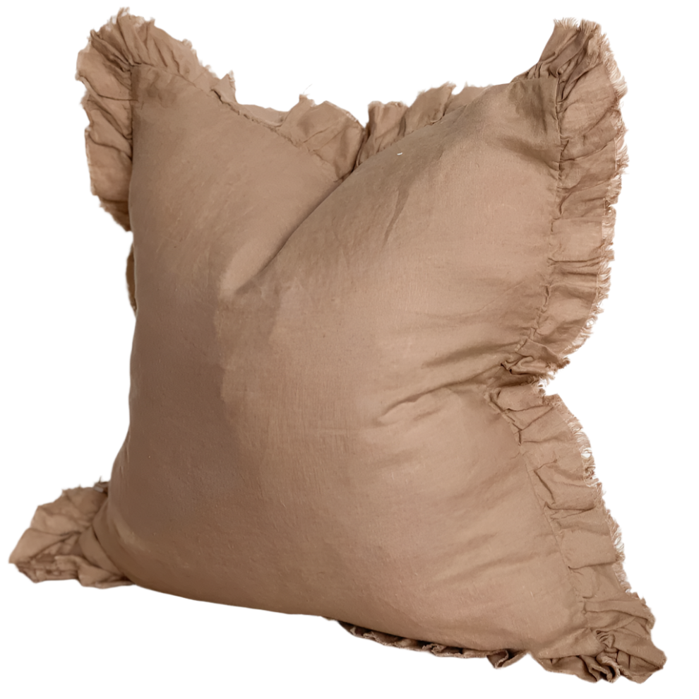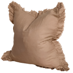 Introducing the exquisite Celia Brown Ruffle Cushion. The rich coffee brown hue of the linen cushion adds warmth and sophistication to your living room or bedroom. Includes luxurious feather cushion filler.