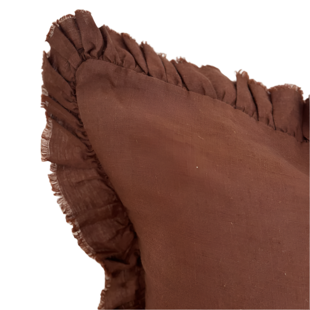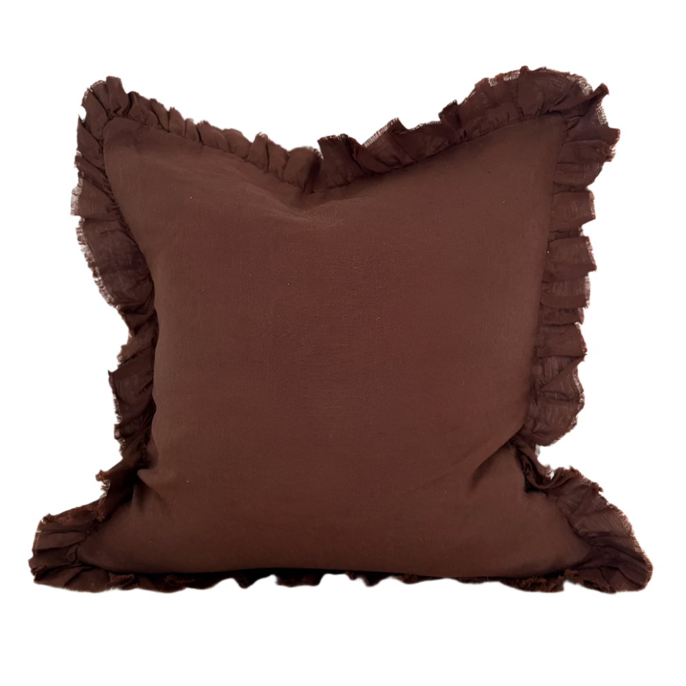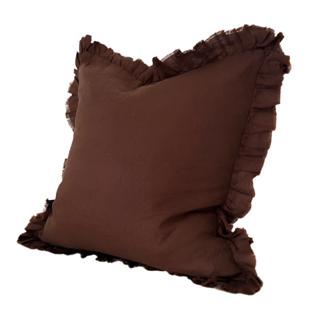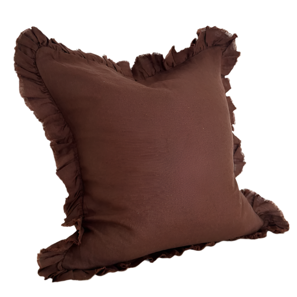 Introducing our Celia Dark Brown Ruffle Cushion. Our Celia cushions are made from 100% stonewashed linen and feature a ruffle edge. Our dark brown tone is perfect for adding depth and warmth to your interiors. Includes luxurious feather cushion filler.
