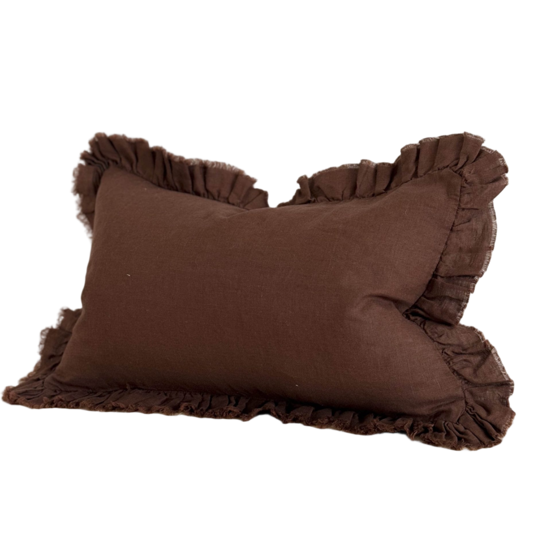 Introducing our Celia Dark Brown Ruffle Cushion. Our Celia cushions are made from 100% stonewashed linen and feature a ruffle edge. Our dark brown tone is perfect for adding depth and warmth to your interiors. Includes luxurious feather cushion filler.