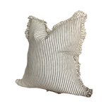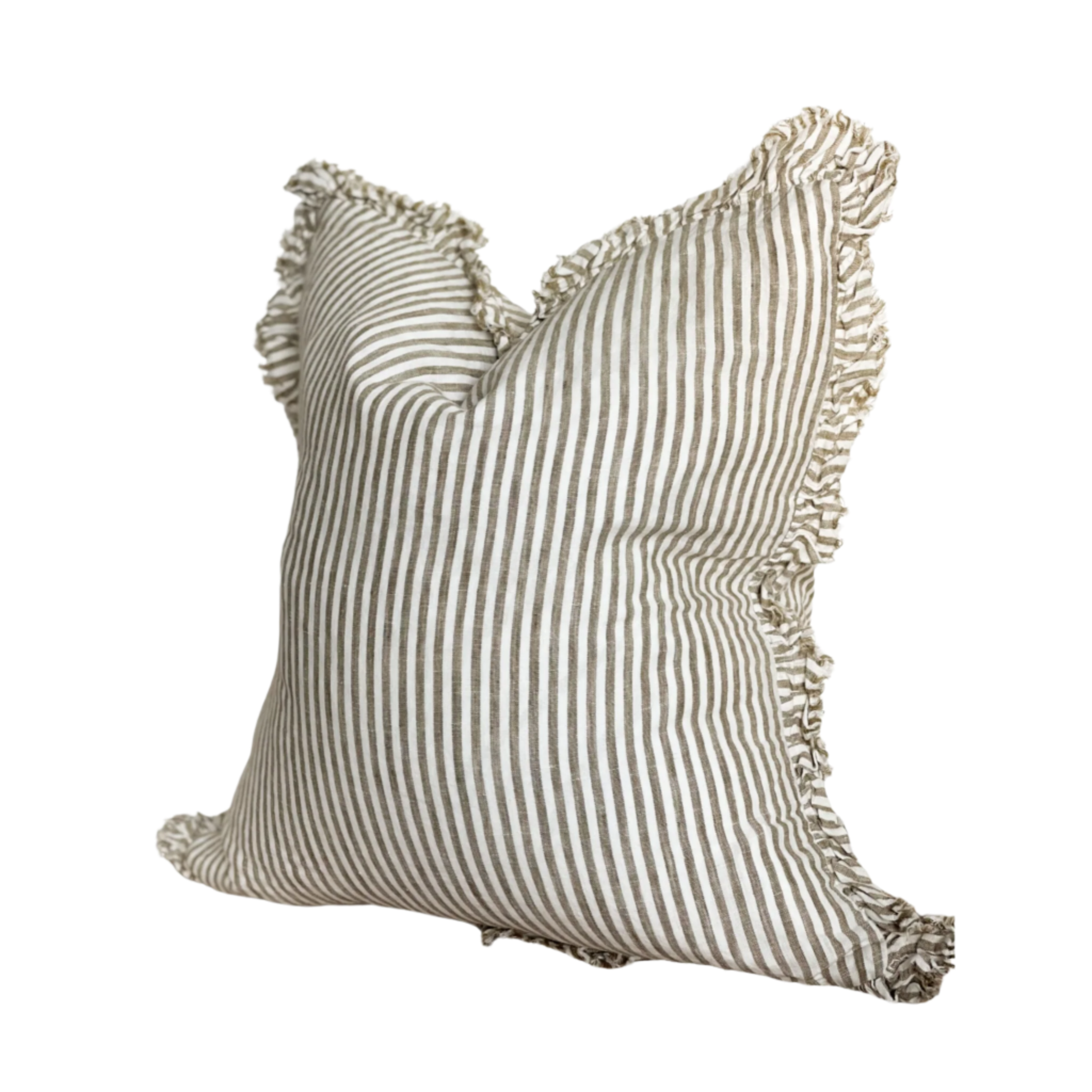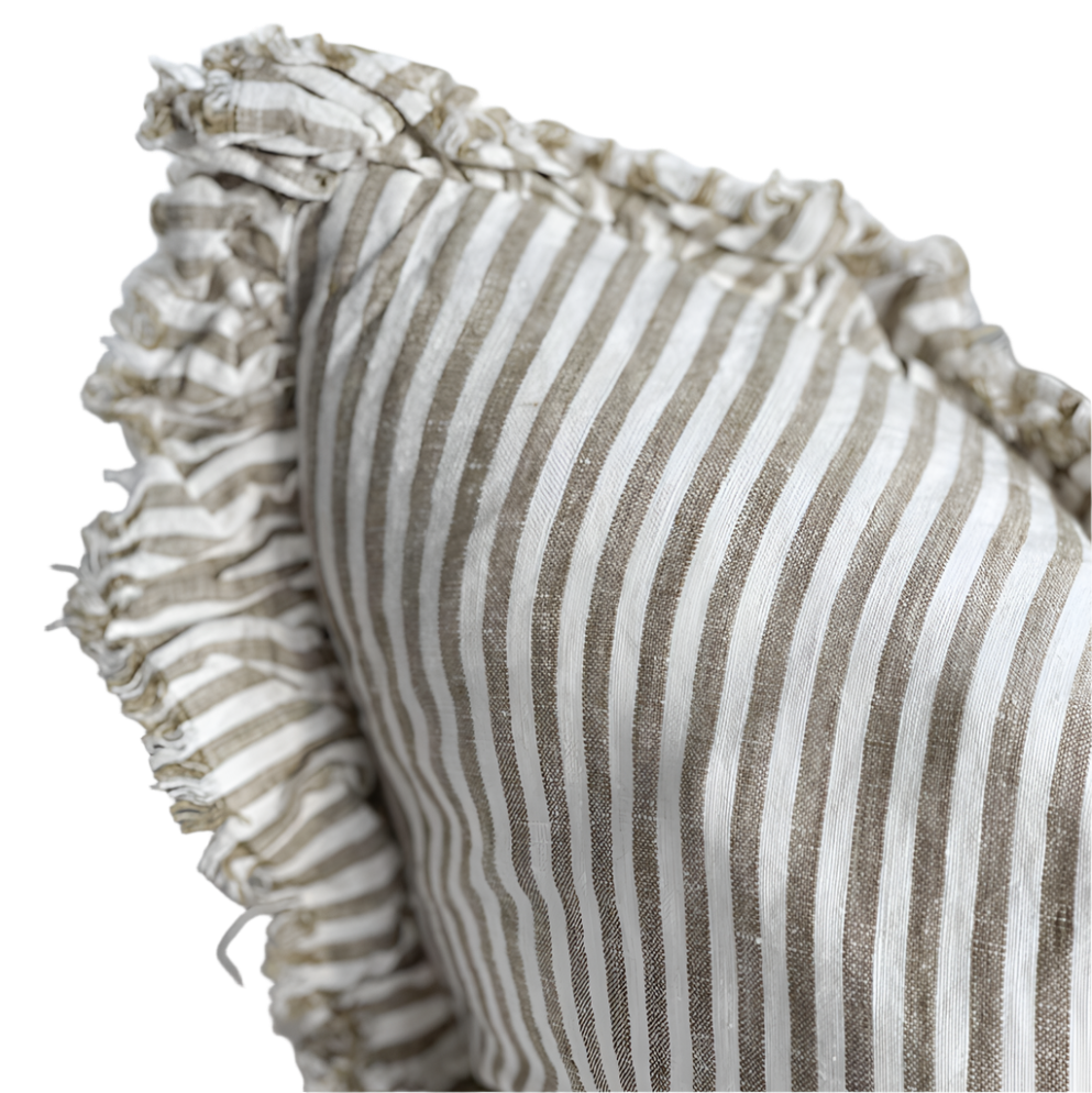 Introducing our Celia Olive Stripe Ruffle Cushion. This linen cushion boasts a stylish light brown design, evoking a sense of timeless elegance. Made from a high quality linen this brown stripe cushion makes the perfect addition to your neutral home decor. Includes luxurious feather cushion filler.