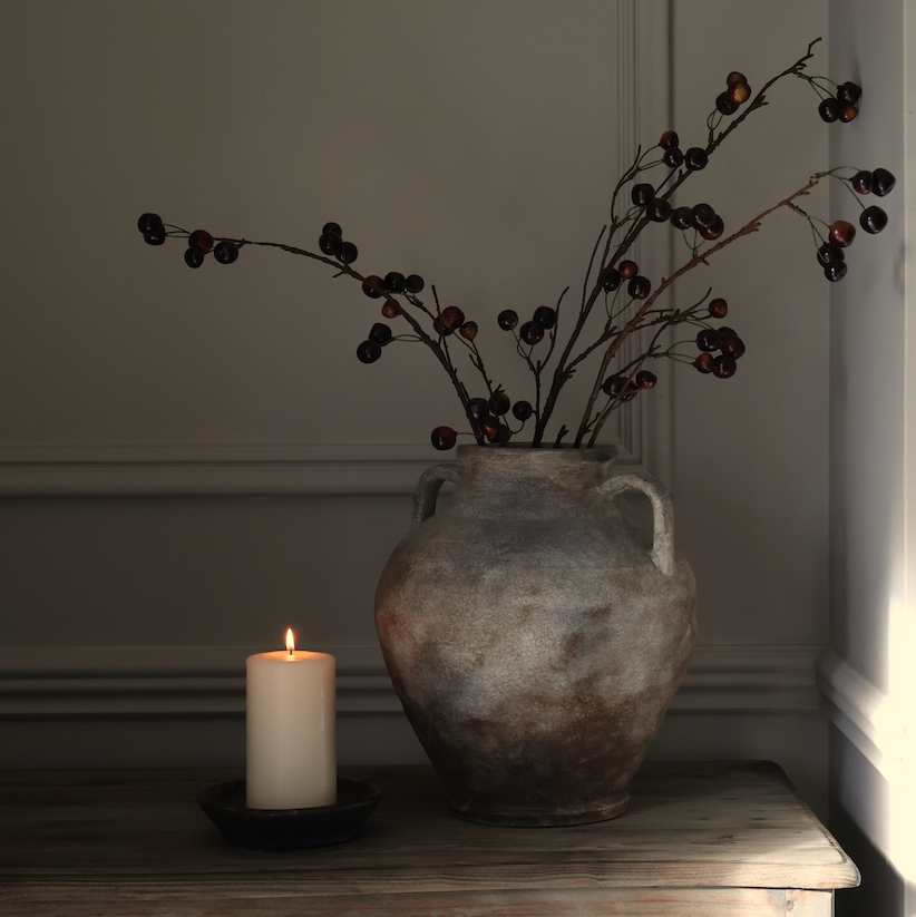 Add a touch of woodland charm with these cherry stems, a beautifully detailed branch featuring deep, glossy berries that capture the richness of autumn. Its natural texture and lifelike tones make it the perfect styling piece for creating warmth and depth in your space all year round. Style a few stems together in a rustic jug or stoneware vase to bring an effortless look to your console, kitchen, or hallway table.