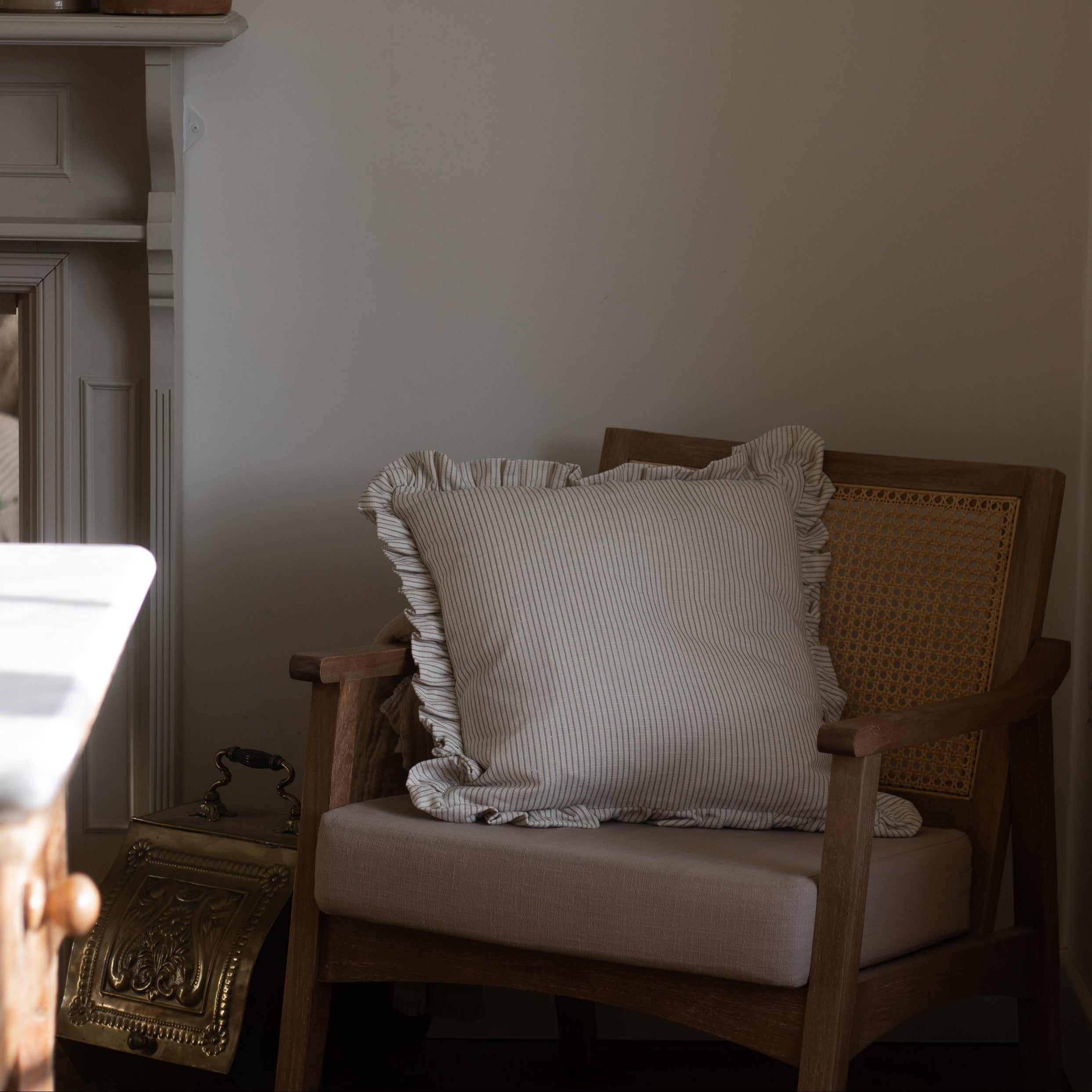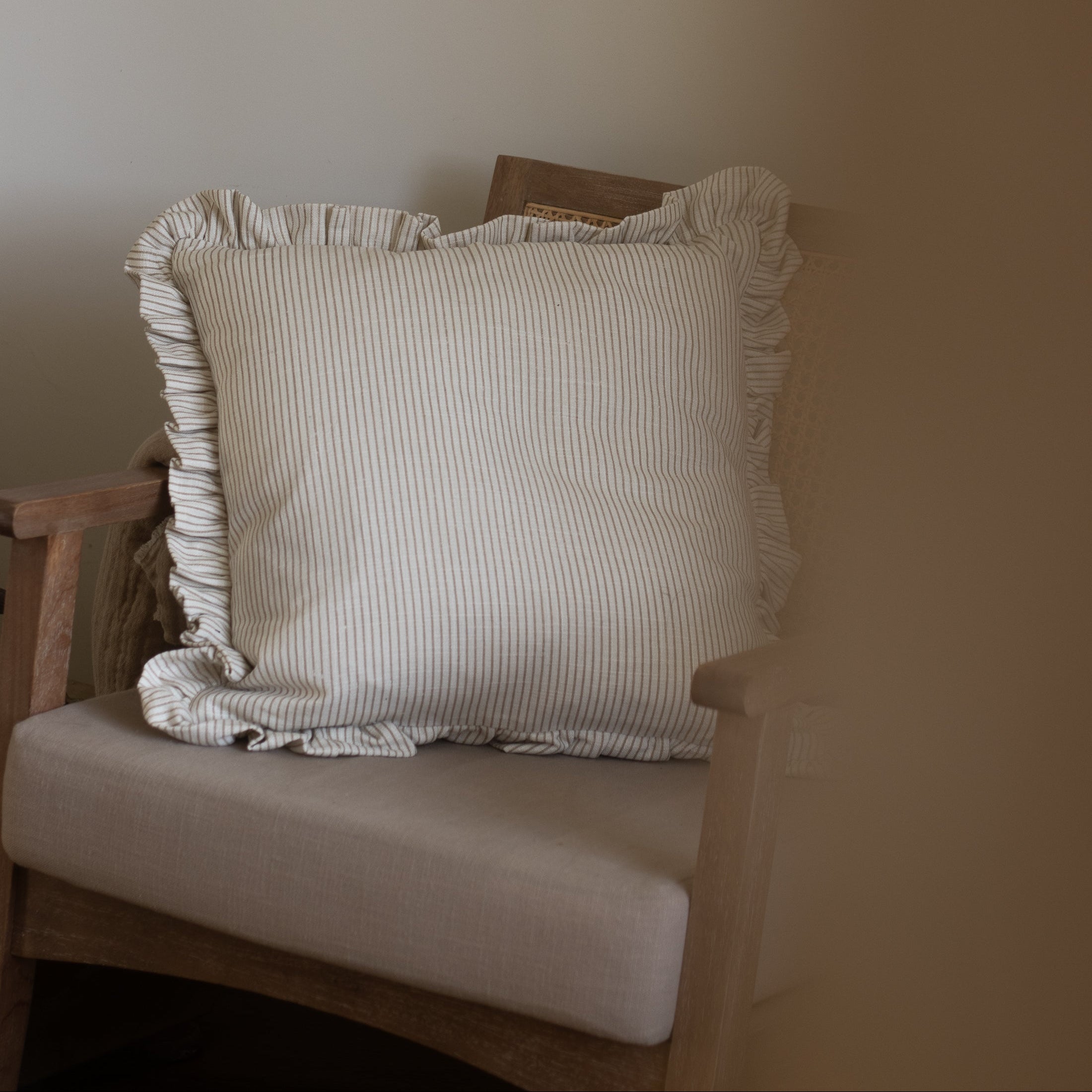 In a gentle beige tone with subtle taupe striping, this cushion offers a more neutral, understated feel. Finished with a delicate ruffled edge, it adds quiet texture and softness to your space.