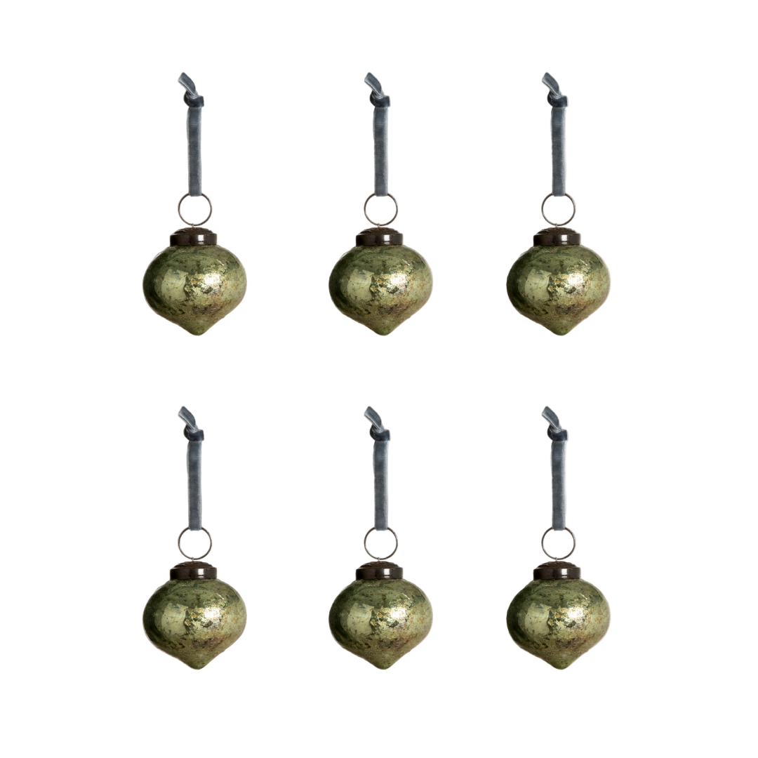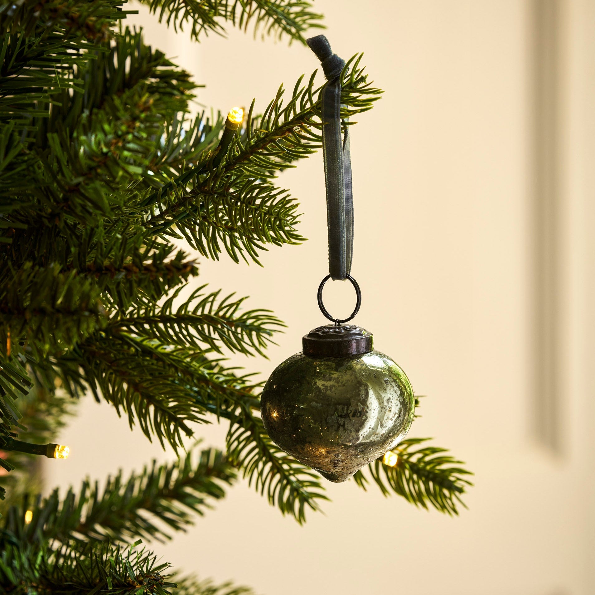 Add a soft, vintage charm to your festive décor with our Green Mercury Glass Baubles. Handcrafted from delicate glass with an aged, speckled finish, each bauble catches the light with a subtle, antique shimmer. Suspended from velvet ribbons in a deep slate hue, they bring a touch of old-world elegance and natural tone to your Christmas tree or garlands.