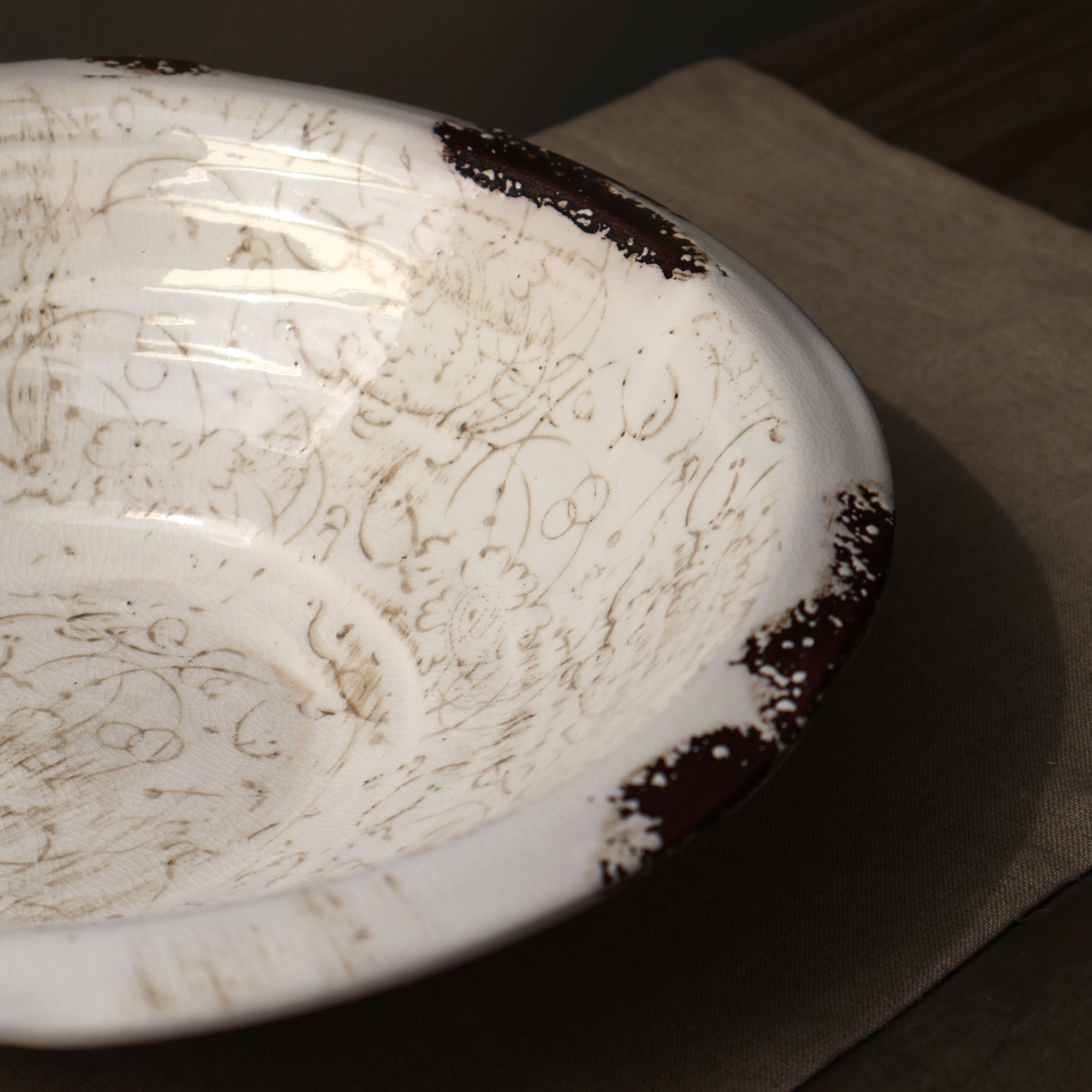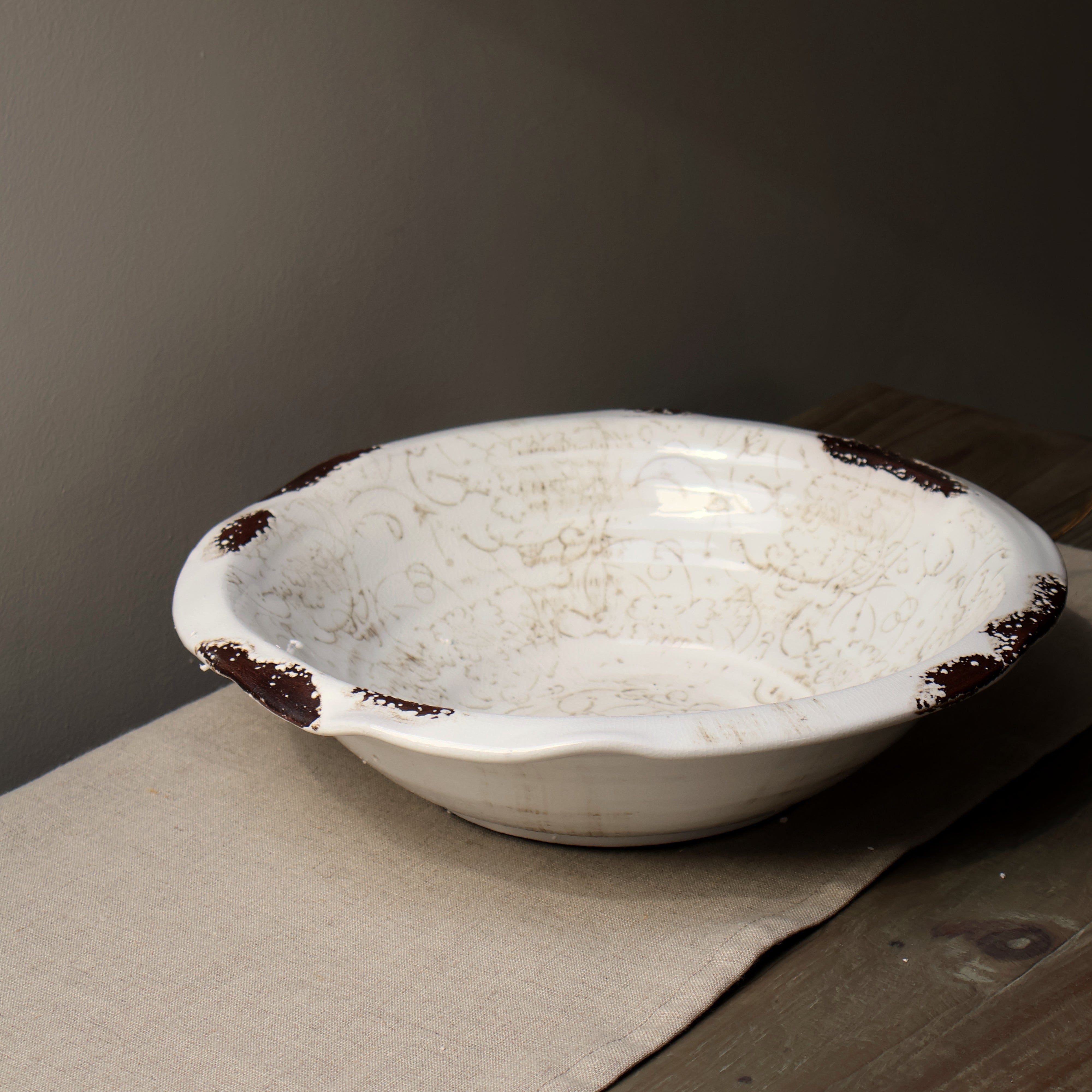 With its subtle distressed finish and beautiful intricate design our Perla White Pattern Bowl is perfect for displaying foliage in or as a stand alone styling piece.