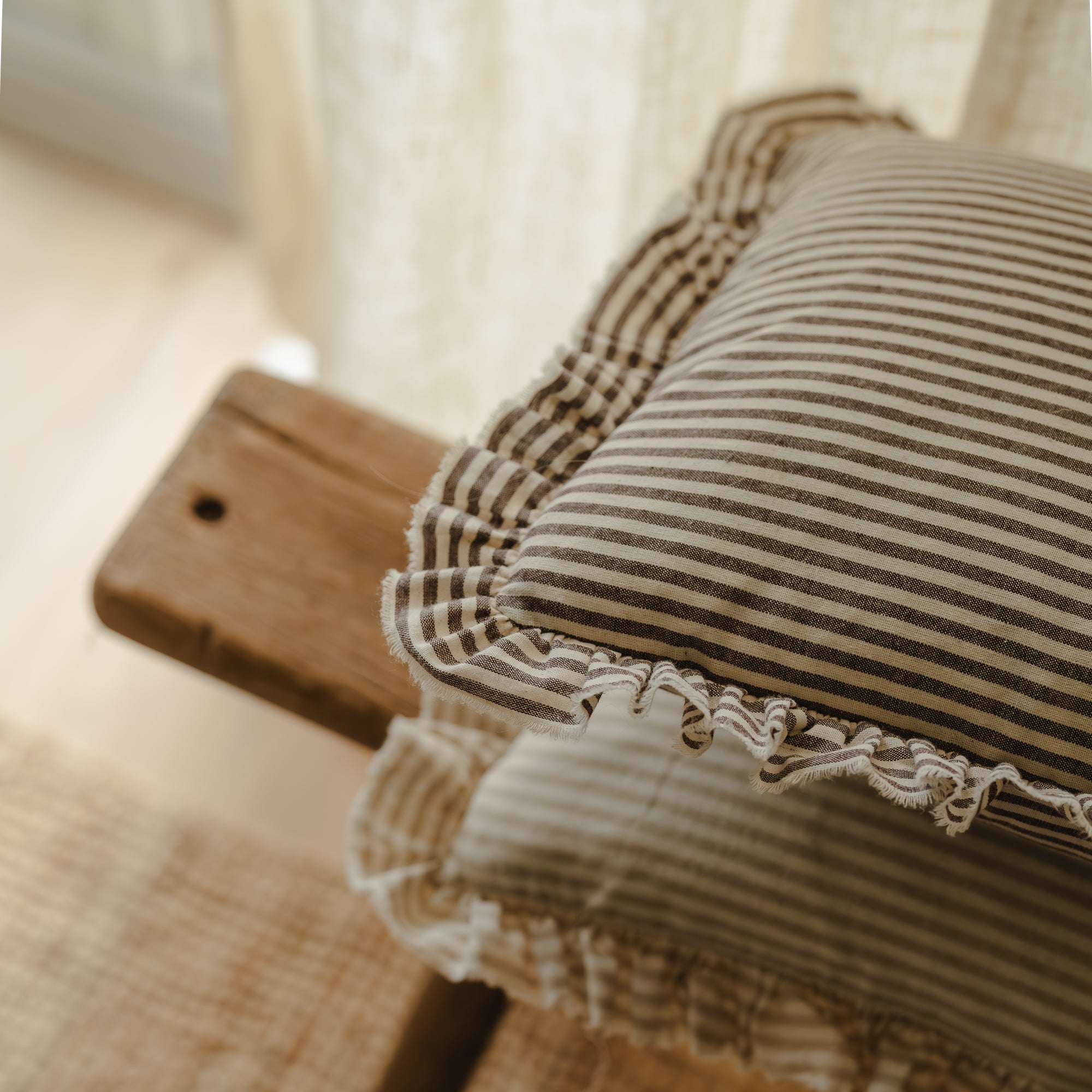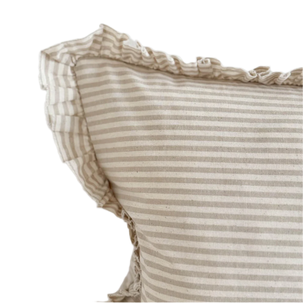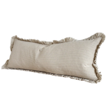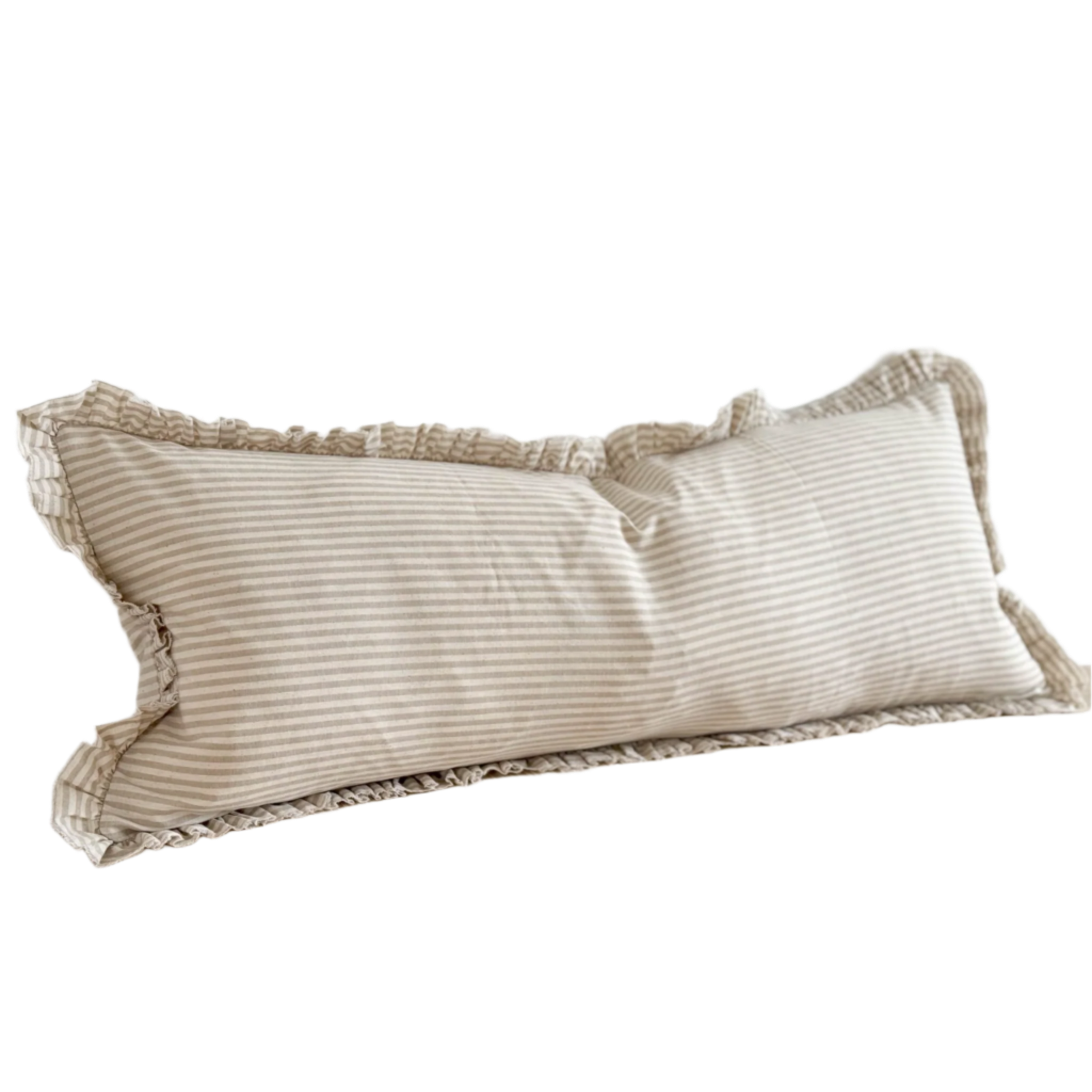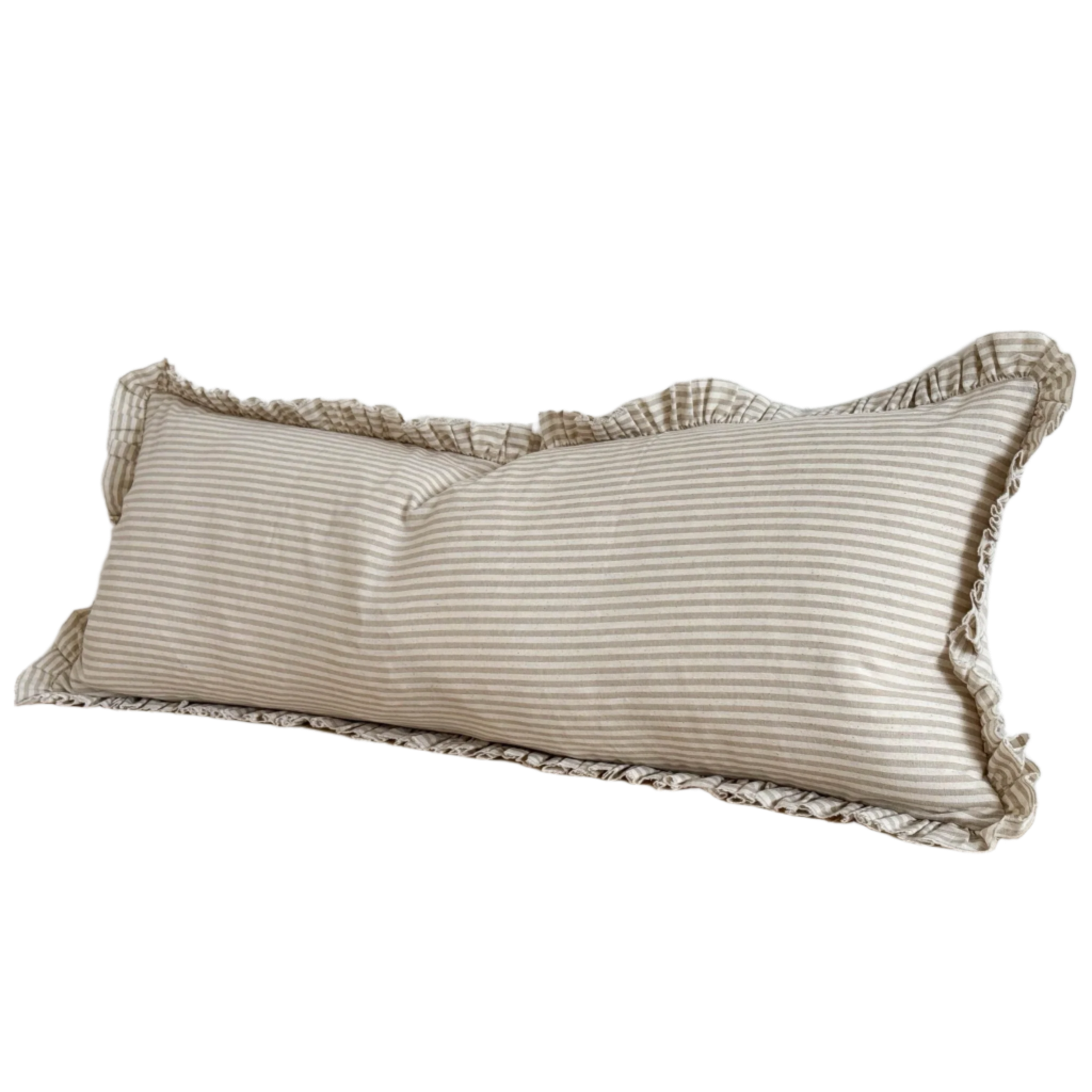 Transform your bedroom space with the timeless elegance of the Raya Beige Stripe Ruffle Bolster Cushion. Made to the highest standard our beige bolster cushion is the perfect neutral touch for any space. Includes luxurious feather cushion filler.