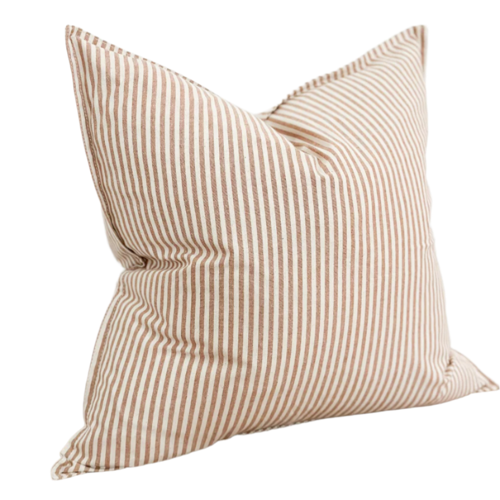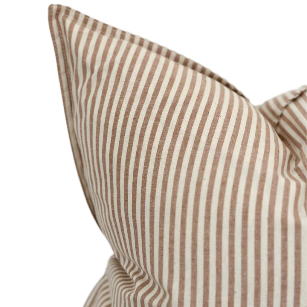 Introducing our Beautiful Raya Brown Stripe Cushion. Our Raya styles feature striped cotton fabric and a ruffle edge. The dark brown colour way is perfect for adding a stylish finish and contrast to your modern country cottage interior. Includes luxurious feather cushion filler.