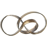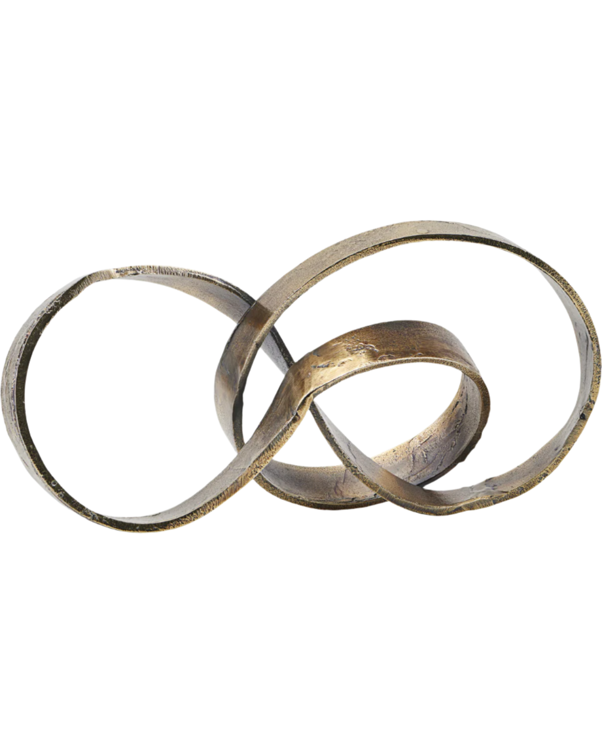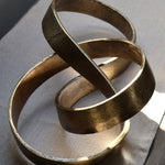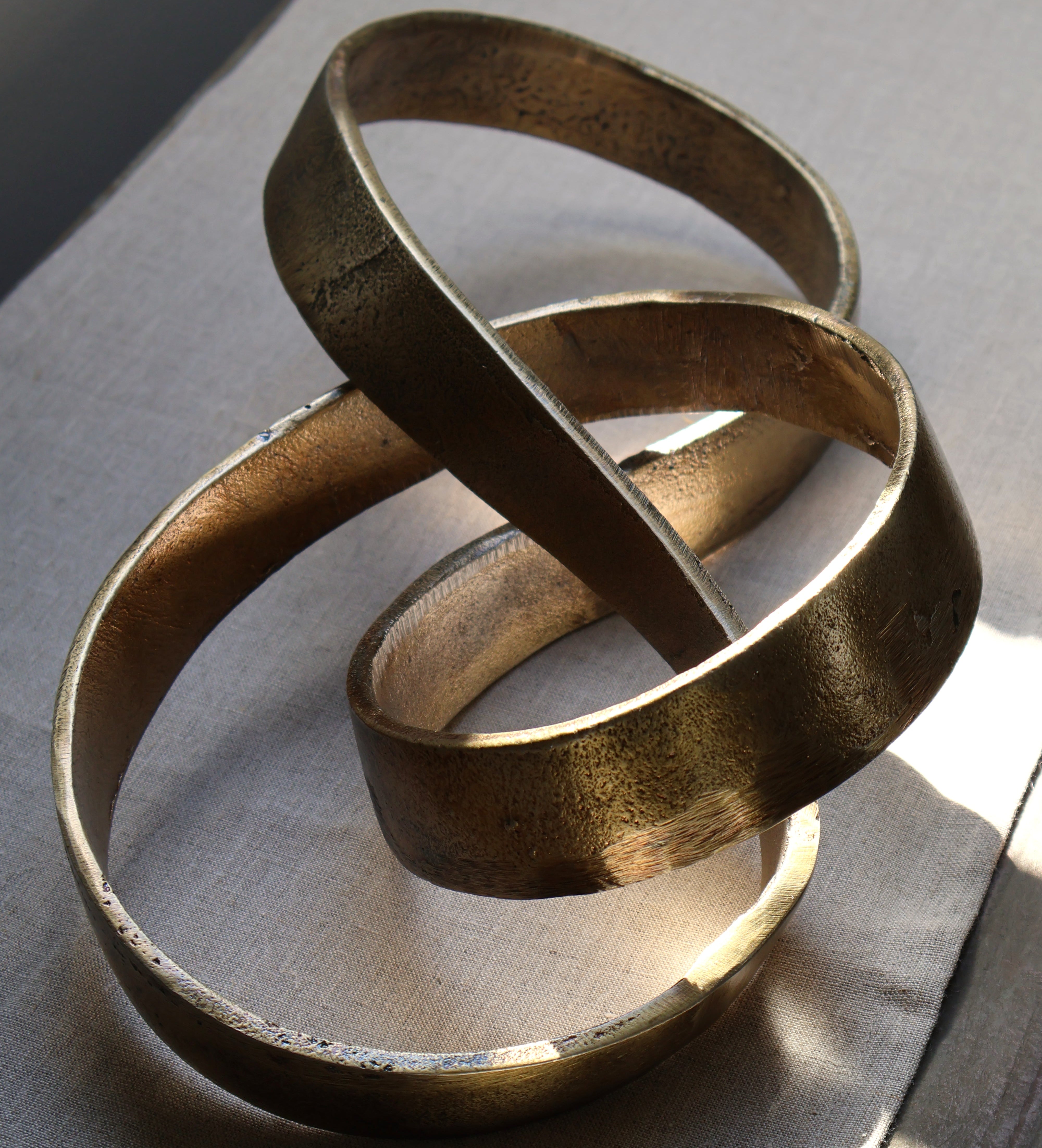 This unique sculpture is made of aluminium with a golden brass finish. Perfect for console styling or adorning a bookcase/shelving unit. Its design is twisted to the point where it almost ties itself into a knot.