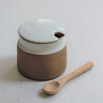A ceramic sugar pot with a small wooden spoon and glazed with a milk white colour. This design is a more contemporary take on a traditional style and looks gorgeous out on the worktop in your kitchen. Handmade small batch pieces by Artisans in Southern India. The glaze is hand dipped so the finish will vary from piece to piece which adds to its character and beauty.